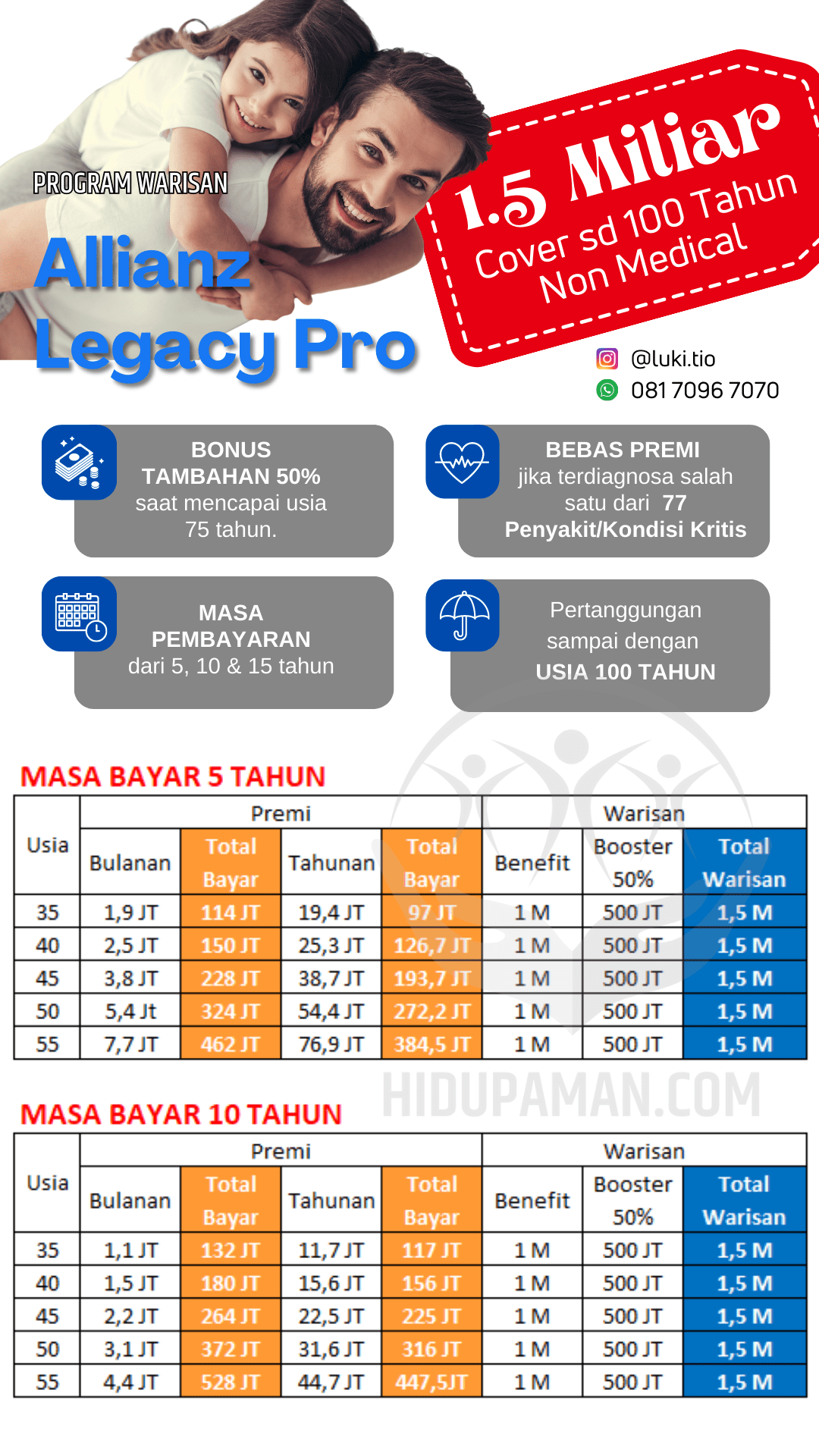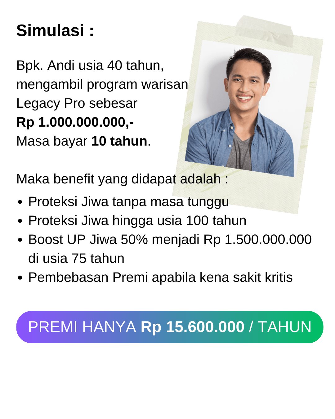 Program Warisan Legacy Pro adalah solusi modern untuk menjamin keamanan hidup dari keluarga Anda bila terjadi resiko kehidupan